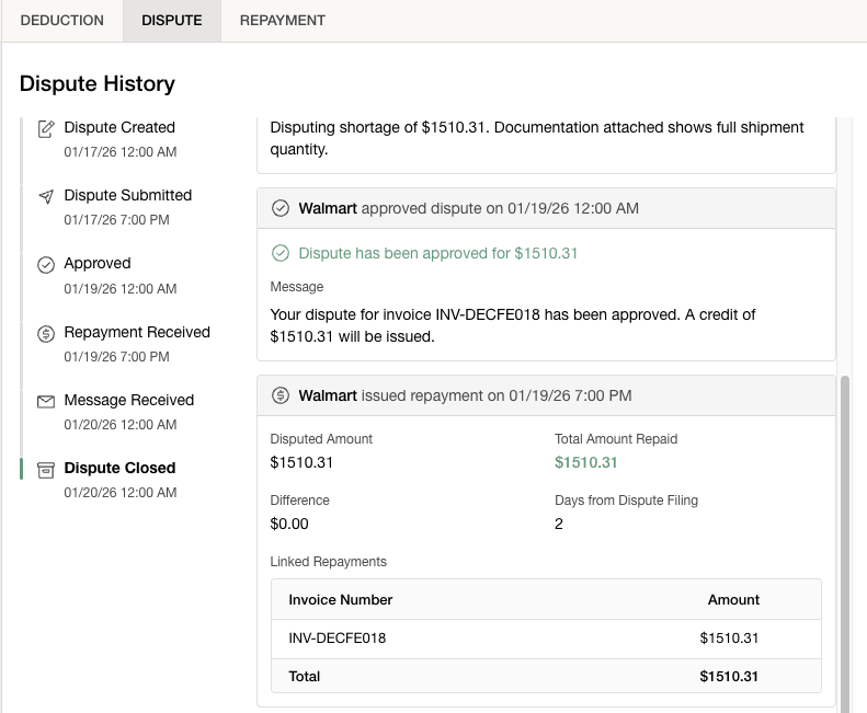 Based on your dispute configurations, the platform intelligently submits disputes directly to vendor portals, or routes cases for your review.