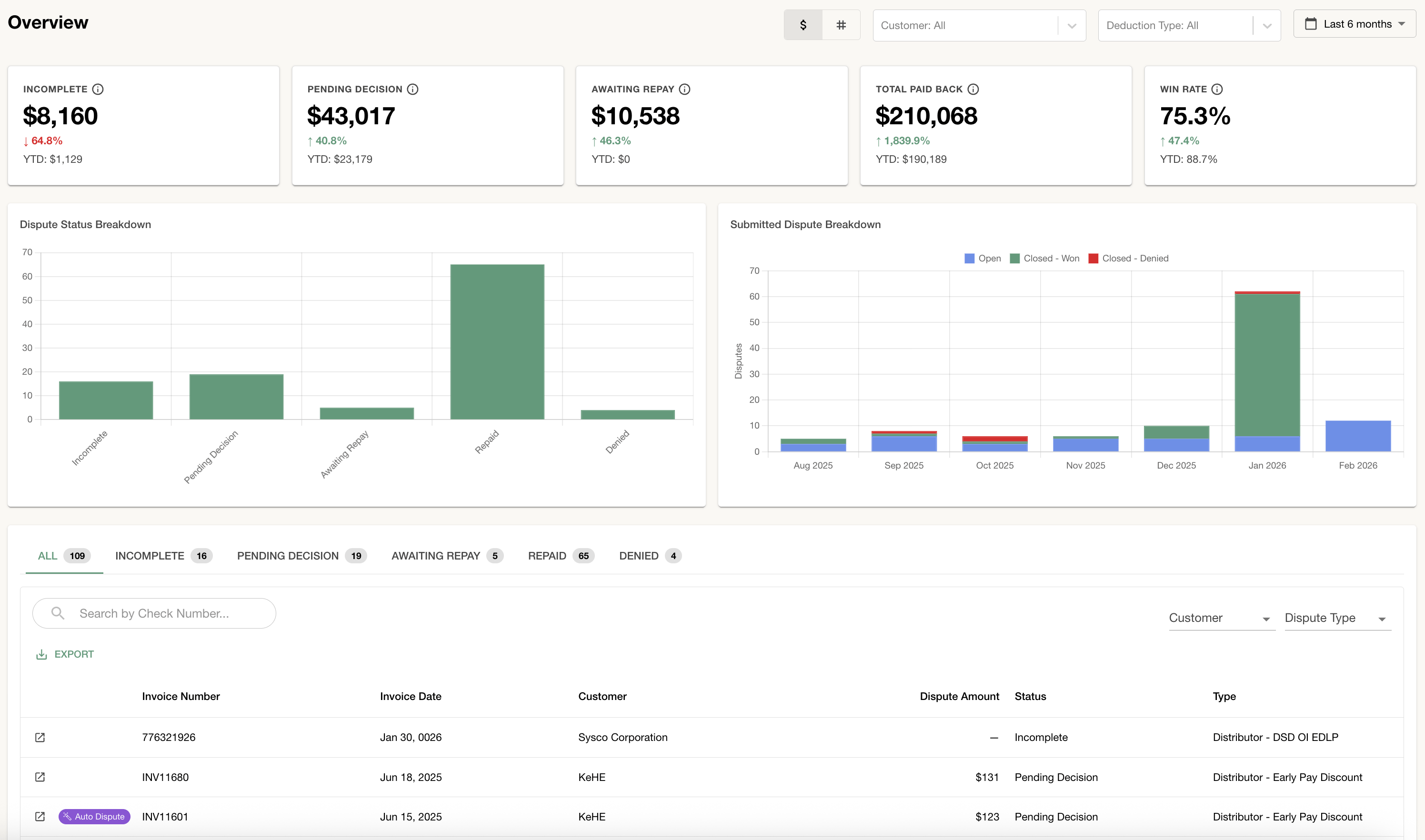 From the comprehensive Disputes Dashboard, get insights into dollars recovered, win rates, and amounts pending.