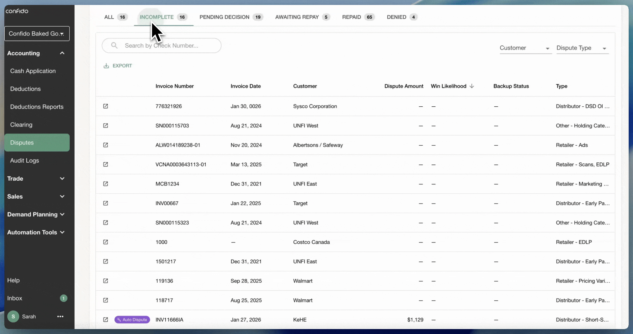 Confido auto-initiates disputes, flags what is a high likelihood dispute, retrieves backup documentation (BOLs, PODs, etc.), and generates dispute messages.