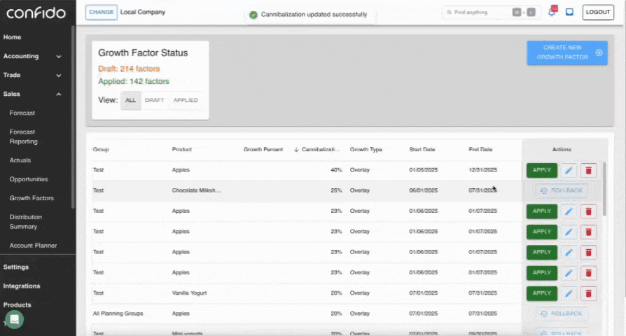 Fresh from Confido: new visibility into cannibalization within growth factors, smarter planning pivots, and a couple UI updates to make day-to-day forecasting smoother.
