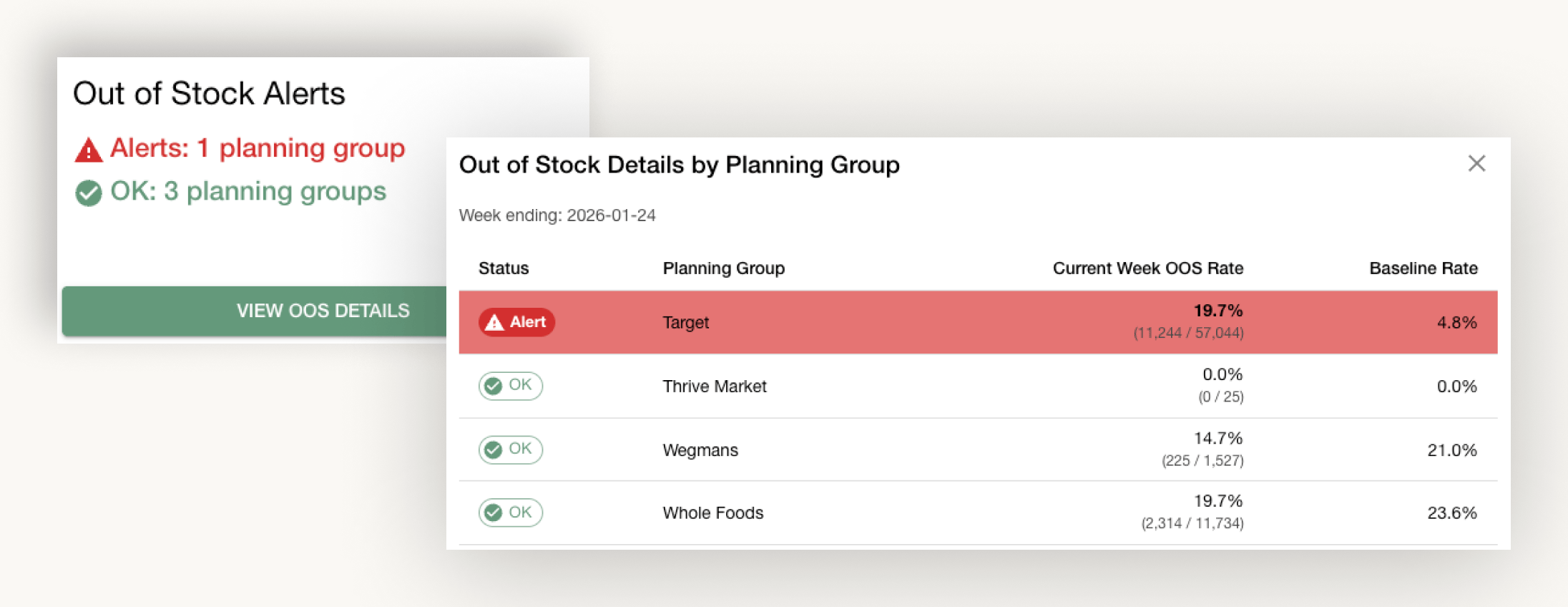 Confido establishes your baseline OOS rate for each planning group, powered by store-level analytics from Muffin