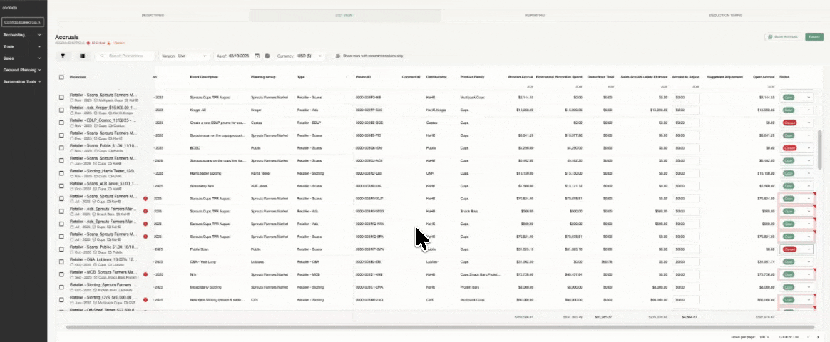 Intelligent close & adjustment recommendations—automatically flag depleted balances, overdue promotions, and latest estimates that have drifted materially from your forecast — color-coded by urgency so your team knows where to act first.